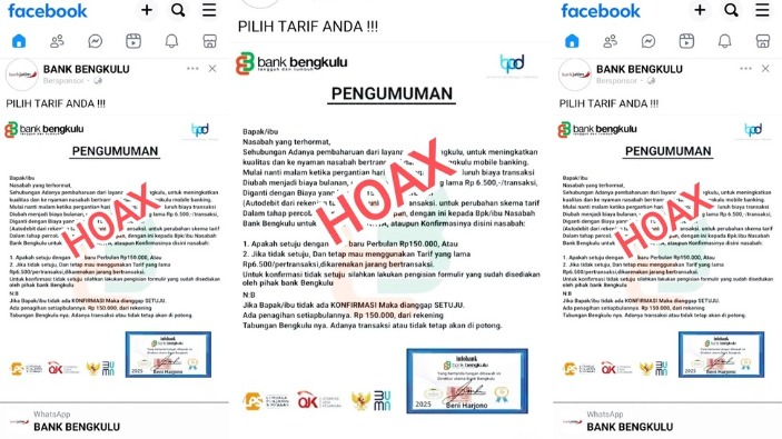 “Kami menegaskan, semua pengumuman mengenai perubahan tarif layanan yang beredar di media sosial adalah hoaks. Bank Bengkulu tidak pernah mengumumkan kebijakan melalui WhatsApp atau selebaran di medsos,” tegas Ade, Rabu (17/9/2025).