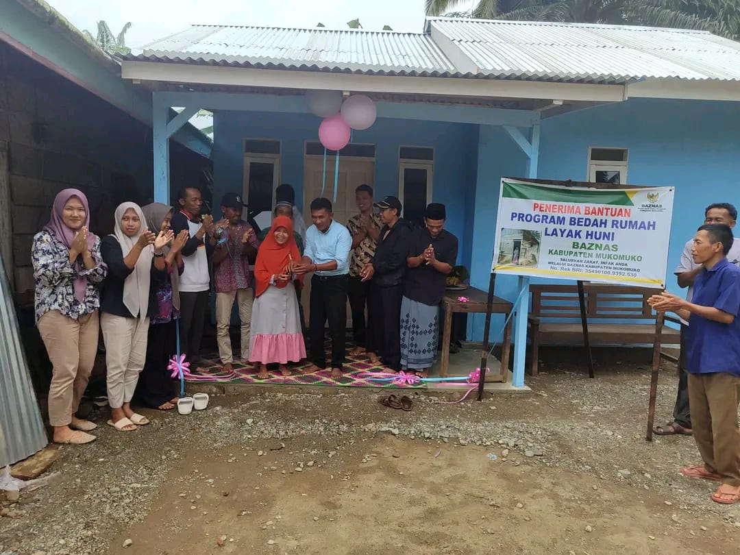 Mukomuko, Word Pers Indonesia – Kebahagiaan terpancar dari wajah Ibu Marsiem, warga Desa Maju Makmur, Kecamatan Penarik, setelah secara resmi menerima Rumah Layak Huni (RLH) hasil kolaborasi Pemerintah Desa, Baznas Mukomuko, dan kelompok gotong royong setempat, Jumat (28/11/2025).
