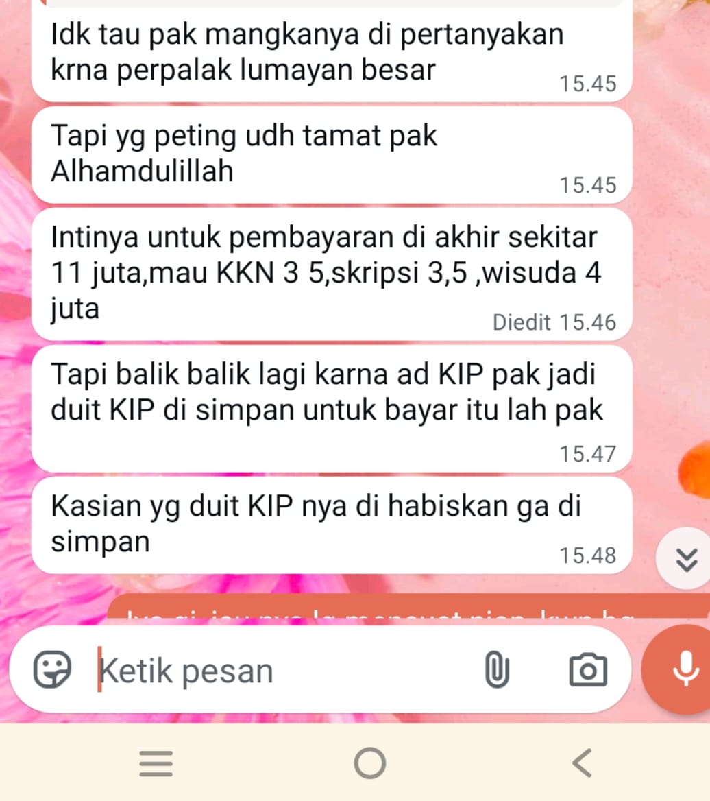 “Kalau dihitung dari awal sampai mau wisuda, totalnya bisa sampai Rp11 juta. Ini sangat berat bagi mahasiswa, apalagi yang kondisi ekonominya pas-pasan. Intinya untuk pembayaran di akhir sekitar Rp11 juta, seperti KKN Rp3,5 juta, skripsi Rp3,5 juta, dan wisuda Rp4 juta, tapi balik balik lagi karna ad KIP jadi duit KIP di simpan untuk bayar itu lah” ungkap salah satu alumni yang enggan disebutkan namanya.