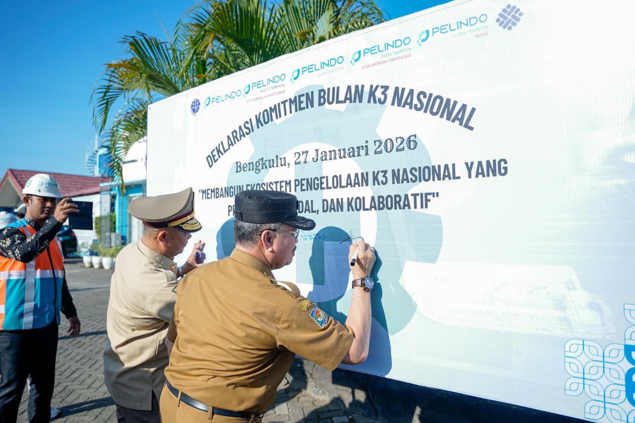 Bengkulu – Peringatan Bulan Keselamatan dan Kesehatan Kerja (K3) Nasional Tahun 2026 di Provinsi Bengkulu digelar melalui upacara di halaman Kantor Pelindo Bengkulu, Selasa (27/1). Penjabat (Pj) Sekretaris Daerah Provinsi Bengkulu, Herwan Antoni, bertindak sebagai inspektur upacara.