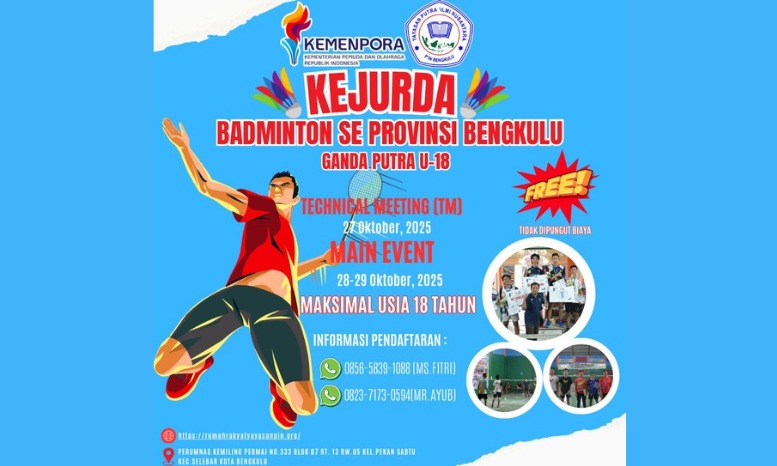 Bengkulu, Word pers Indonesia – Semangat pembinaan atlet muda di Provinsi Bengkulu kembali digelorakan. Kementerian Pemuda dan Olahraga Republik Indonesia (Kemenpora RI) bekerja sama dengan Yayasan Putra Ilmi Nusantara (PIN) Bengkulu, serta mendapat dukungan penuh dari Anggota DPR RI Dapil Bengkulu, Dr. Hj. Dewi Coryati, M.Si., siap menggelar Kejuaraan Daerah (Kejurda) Badminton Ganda Putra U-18 se-Provinsi Bengkulu pada 28–29 Oktober 2025.