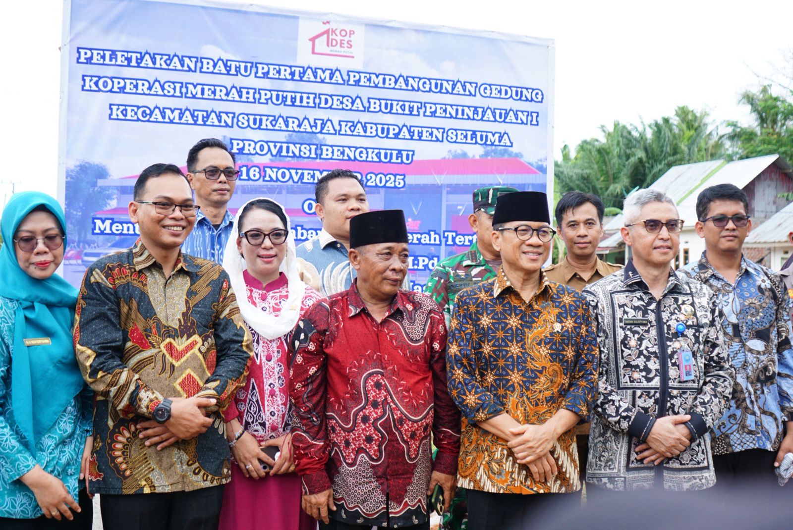 Seluma – Anggota DPD RI dari Provinsi Bengkulu, Apt. Destita Khairilisani, S.Farm., MSM., mendampingi Menteri Desa dan Pembangunan Daerah Tertinggal (Mendes PDT) Yandri Susanto dalam peletakan batu pertama pembangunan Koperasi Desa Merah Putih (KDMP) di Desa Bukit Peninjauan I, Kecamatan Sukaraja, Kabupaten Seluma, Minggu (16/11).