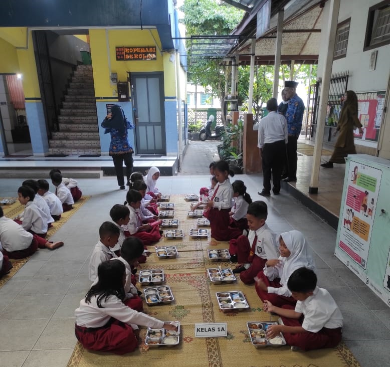 Di samping itu para siswa sembari duduk lesehan menikmati dengan penuh keceriaan hidangan MBG yang di olah oleh tim Dapur Sekolah dengan melibatkan para petugas dan pengelola kantin sekolah yang ada.
